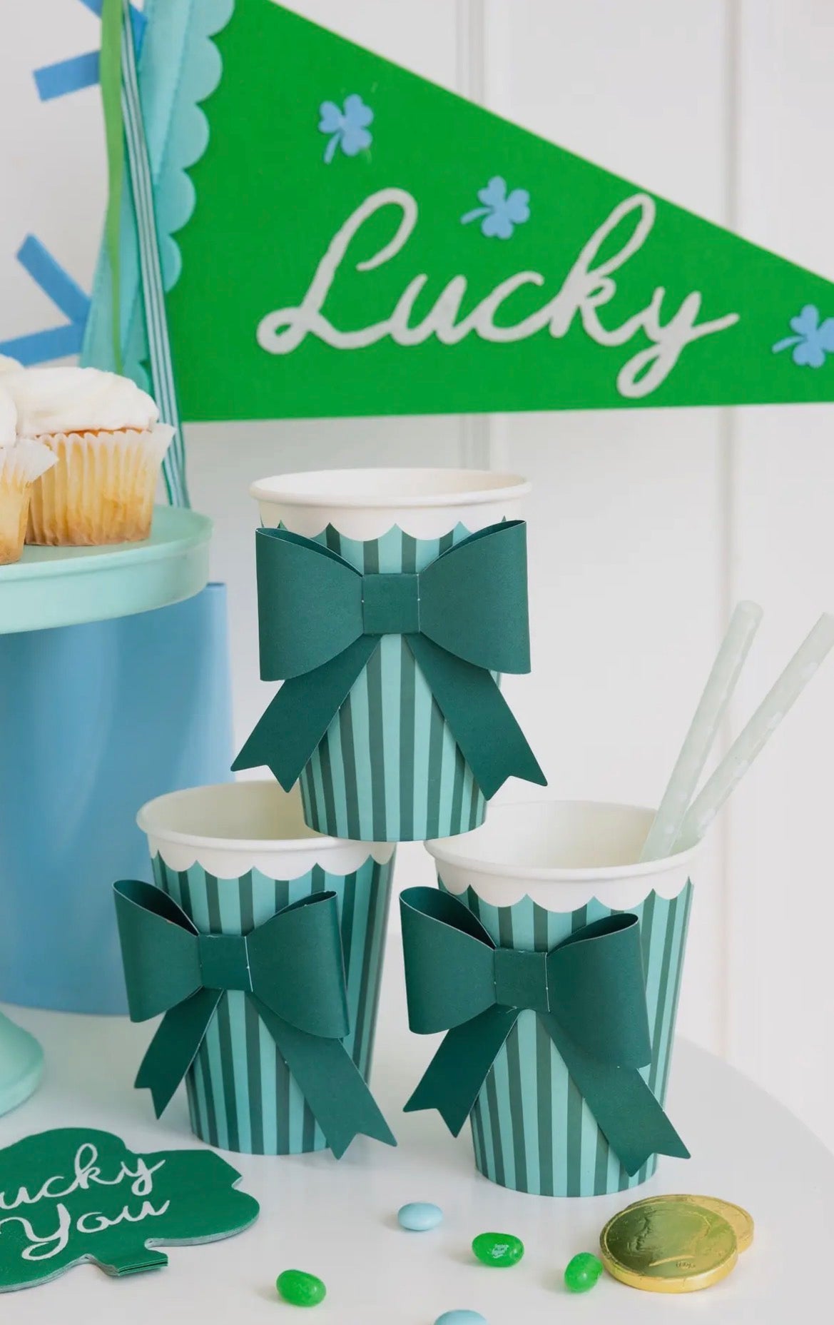 Celebrate St. Patrick's Day in style with these festive green and mint striped bow cups! Perfect for adding a playful touch to your holiday table, these charming cups feature adorable bow details that bring extra flair to any St. Paddy's Day gathering